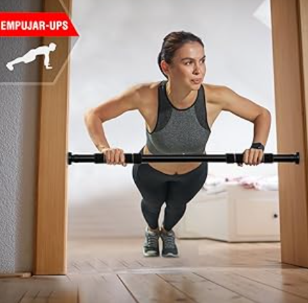 La barra de dominadas de tracción Ultrasport es el equipo ideal para entrenar espalda, bíceps, tríceps y abdominales desde la comodidad de tu hogar. Gracias a su sistema telescópico ajustable de 66.5 cm a 93 cm, se adapta fácilmente a la mayoría de marcos sin necesidad de taladrar ni atornillar, manteniendo la integridad de tu puerta y facilitando el montaje rápido y seguro.